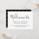 Lägg till detta enkla men eleganta meddelande med välkomstpresenterna för er bröllopsfest. Detta välkomstkort för bröllop har en enkel svart-vit design med stilren handskriven text. Anpassad text låter dig lägga till ditt eget personliga meddelande.