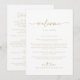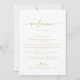 Denna moderna elegant, guld bröllop, välkomnar brev är perfekt för ett nordligt bröllop. Den enkla och elegant designen har skripttypografin klassisk, guld och finare. Anpassa fronten med ett välkomstmeddelande till dina gäster och till namn. Anpassa baksidan med schemat för händelser och annan användbar information.