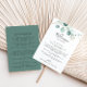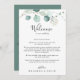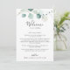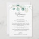 I somras är grönten eukalyptus bröllop välkomna brev är perfekt för ett modernt bröllop. Utformningen har vackra, handmålade vattenfärgade löv av grönten eukalyptus, inspirerande naturcharm. Anpassa fronten med ett välkomstmeddelande till dina gäster och till namn. Anpassa baksidan med schemat för händelser och annan användbar information.