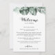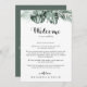 Det tropiska gröna vita bröllop välkomna brev är perfekt för ett bröllop i Nordafrika. Grönt handflatan lämnar buketter med vita vackra blommor. Anpassa fronten med ett välkomstmeddelande till dina gäster och till namn. Anpassa baksidan med schemat för händelser och annan användbar information.