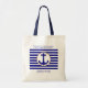 Välkomstpåse för giftermål med ankare och marint blått rand. Anpassa text överst och grund som hälsar gäster till ett "kryssningsgäst bröllop", "badbröllop" eller spelar ingen roll som du föredrar. Lägg till mer än färgad, fet skripttext till grund, med namnen av bruden och brudgummen och bröllop-datumet.