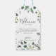 Dessa kalligrafskript grönt foliage bröllop välkomna presenter är perfekt för ett enkelt bröllop. Konstruktionen har vattenfärgad handdragen elegant botaniskt eukalyptus grenar och löv, placerad i vackra bouquets och geometriskt mönster. Dessa märkre är perfekt för hotellgästväskor och destinationsbröllop.