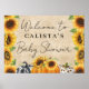 Denna vackra poster har tre snygga pumpor i orangen, svart och vit plaid, och leopard-tryck på en sprängtryckning. Söt gult solblommor gräns på skyltens sidor. "Välkomna" i en handskriven kursiv typografi visas överst tillsammans med den mamma som ska visas under namn och "Babyskor" under.