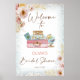 Vintage Blommigt Traveling Möhippa Välkommen att Poster Sweet vintage, bohemisk blommigt som reser från Miss till möhippa välkomstskylt med två och guld färgad-arrangemang, en dekorativ kalligrafirubrik, tre resväskor och en världsomspännande och internationell passet.