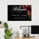 Förbräk tidlös elegans för ditt gotiskinspirerade firande med vår fängslande välkomstskylt för bröllop poster. En mjuk svart bakgrund ger perfekten arbetsyta för en fängslande, men underskattad bukett. Föreställ dig ett hörn arrangemangt av muterade ro blommar, där och rik av röntgen blandas med mörk grönt löv. Den här eaterala designen utstrålar tyst sofistikering, perfekt för paret som söker en aning romantiskt mörker. Dina uppgifter om bröllop visas i ett modernt typsnitt och ser till att de visas på ett bra sätt. Den här fantastiska utformningen skapar en verkligt oförglömlig inbjudan till er speciella dag, som anger tonen för ett moody och elegant firande i kärlek. Skapat av Farmhouse Press.