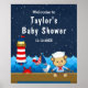 Den här söta och roligt välkomsttecknet har en sjömansapa på ett trädäck med fiskmås och en krabba. I bakgrunden finns ett rött och vitt fyr, en söt fågel på en segelbåt, havets vinkarare och en marinblå stjärnkväll himlar. Texten kombinerar djärvt och seriöst typsnitt för en snyggt och ett modernt utseende. Det här är perfekt för en nautisk temerad babydusch.