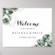 Denna tropiska gröna vita blommigt bröllop välkomna poster är perfekt för ett rustiskt bröllop. Grönt handflatan lämnar buketter med vita vackra blommor. Gör detta till ett eget poster genom att lägga till namn i bruden och brudgummen och datumet för bröllop.