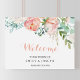 Denna moderna rosa tropiska blommigt välkomnar bröllop poster är perfekt för ett destinationsbröllop. Utformningen har vackert handmålad vit, rosa, blommor med grönt löv, skisser av nåd och elegans. Gör detta till ert poster vid namn i bruden och brudgummen och vid bröllop.
