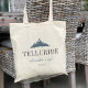 Välkomna gäster till ditt vintridsbröllop med chicen och modern personlig tote bags. Utformningen illustrerar snöbergens toppar i blått med bröllop-målet under (visas med Telluride, Colorado) i klassisk serif-skrift. Lägg till namn under i handskrivet kursivt skript och året. Färg kan ändras för att matcha bröllop färg med Zazzles design verktyg.