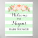 Välkomna till babyskylten poster med eget namn i mynta grönt och vita rand mönster med vintage persikofärgade vattenfärgblommor i rosa med handskrivna stil-bokstäver.