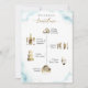 Välkomna gästerna med det här fantastiska kortet med elegantens tidslinje på framsidan och välkomstmeddelande på baksidan. Tidslinje med vattenfärgsikoner i vackra gyllene nyanser. Både fram och tillbaka med ömtålig, dammig, blå vattenfärgsfläckar med udda guld-spräcker. Modern skriftlig kalligrafiinformation i guld. Möjlighet att "ta och flytta" tidslinjeikonen bilder till en annan ordning än kostym genom att välja att anpassa ytterligare.