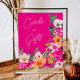 Ett kort- och presenttecken med Elegant ljusa och djärva, moderna sommarblommor i vår med söt överdimensionerad blomma i vild och möhippa för penselskript med en modern kalligrafi-typografi med skarp rosa, orange, grönt och gula blommor på nybörjare rosa