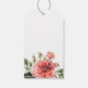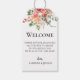 Vattenfärgad blommigt bouquet i skalor av korall, rosa och persikor med flytande löv, bröllop välkomna märkre av presentsäck. Anpassa och anpassa teckensnittet stil, färg och storlekt.