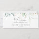 Det här älvgröna hängande välkomsthuvudet för sittande sjökort är perfekt för ett modernt bröllop. Den botaniska utformningen av eleganten har ljus- och mjölkfärgen eukalyptus accentuerad med vismisk löv i guld glitter. Kortet skrivs ut på framsidan och baksidan (dubblan). Kontrollera om det finns några koordinerande platskort för bordsnumret.