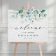 I bröllop välkomsttecknet finns färgade vattenfärgseukalyptus, botaniska gröntar och ljusblå löv med ett modernt snurrskript.