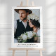 Elegant och enkla, minimalistiska välkomsttecken i bröllop innehåller svart text som innehåller namnen för bruden och brudgummen med bröllop-datum på vit bakgrund och visningar en anpassningsbars foto.