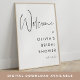 Välkomna gäster till din möhippa, babydusch, förlovningsfest, bröllop eller speciella händelse med den här elegantens minimala tecken, som kan hämtas digitalt eller skrivas ut professionellt. Utformningen innehåller "Välkommen till [event namn]" med datumet nedanför, i mjukt svart handskript och sans serif-bokstäver på en skarp vit bakgrund. Koordinerar våra minimalistiska skript-möhippa- och babyduschsamlingar.