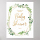 Välkomna gäster till er baby shower med denna vackra vattenfärg blomster skylt i grönt med texten 'baby shower' i falskt guld folie.