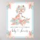 Fox-babyduschens välkomsttecken med sötvattenfox med blommor och fjäder krona på en vacker blommigt och ludderbakgrund. Den här välkomstskylten för foxbabyduschen är lätt att anpassa med texten. Du kan också ändra bakgrunden till färg.