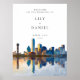 Denna eleganta vattenfärg-välkomstskylt för bröllop med siluett av Dallas kan anpassas med din information i modern typografi. Designad av Thisisnotme©