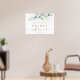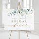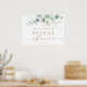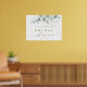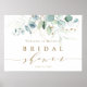 Denna välkomstskylt för bröllopsfest har målade akvarell-eukalyptusblad, gröna och gyllene glitterblad med gyllene text.