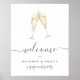 Välkomstskylten för förlovningsfest eller bröllop är ett hakchampagneglas i vattenfärg, fyllt med bubblor. Anpassa med tre linjer anpassningsbar text nedanför, med välkomsttexten och parets namn och händelsetyp.