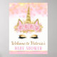 Välkomstskylt för enhörningsbabyfirande med söt rosa och guld enhörning på en rosa och guld bokeh-bakgrund. Denna eleganta enhörningsvälkomstskylt kan enkelt anpassas med den text du önskar.