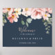 Denna välkomstskylt för eukalyptusträdan ro blommigt bröllop är perfekt för ett rustiskt bröllop. Utformningen har rosa, blommor, gul ros med eukalyptus löv i en mörk marin blå bakgrund. Gör detta till ett eget poster genom att lägga till namn i bruden och brudgummen och datumet för bröllop.