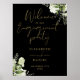 Denna eleganta välkomstskylt för förlovningsfest med botaniskt grönska och blomstermotiv i svart och guld kan anpassas med din information i chic typografi. Designad av Thisisnotme©