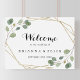 Det geometriska gröna välkomsttecknet i guld är perfekt för ett bröllop i Österrike. Utformningen har handdragna botaniska gröntar eukalyptus grenar och löv som adorerar elegant ram. Gör detta till ett eget poster genom att lägga till namn i bruden och brudgummen och datumet för bröllop.