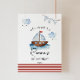 Nautisk segelbåt, temad födelsedagsfest eller babydusch välkomstskylt med båt, moln, vatten och fåglar.