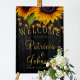 Elegant faller bröllopsskylt snyggt välkomstskylt poster mall på mörk brun laduvirke som bakgrund med stora gula solblommor i gult, strängar av tvinklad varm ljus och ett ändringsbart smink av typen finare guld. +++++++++++ Anpassa den med dina uppgifter! Du kan välja att anpassa det ytterligare genom att ändra typsnitt och färg på text. +++++++++++++++ Det är lämpligt för elegant sommarnatt eller höstfall/land trädgård/bakgård bröllop.