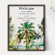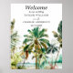 Den här eleganten och den vackra vattenfärgen bröllop välkomstskylt har en strand och handflatan träd. Texten kombinerar handskript och sans serif typsnitt för en snyggt och ett modernt utseende. Det här är perfekt för en sommarstrand eller ett tropiskt destinationsbröllop.