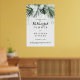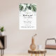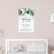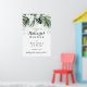 Välkomsttecknet för den tropiska gröna middagen är perfekt för en rustisk bröllop-repetition. Grönt handflatan lämnar buketter med vita vackra blommor.