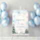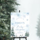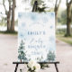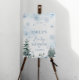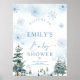 Vinter Wonderland babydusch välkomstskylt poster med blått snöflingor och gräs träd.