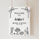 Whimsical Black Drawn Möhippa Välkomstskylt Hand plockade som är redigerbar möhippa och som innehåller två knärör, lite mat och dryck. Den här skylten med svartvit möhippa innehåller även handskriven stil typsnitt.
