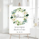 Blommigt Bröllop välkomstskylt med en vattenfärgad vit blomma med grönt löv. Om du vill ha en mer avancerad anpassning av den här designen klickar du på knappen Anpassa. Matchande objekt är också tillgängliga.