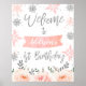 Vinter Onederland Första födelsedag Välkomstskylt Sweet rosa och silver vinterland första födelsedag välkomstskylt eller poster med en rosa blommigt arrangemang och rosa och silver snöflingor. Det här är ett sött sätt att välkomna gästerna till din lilla flicka när de kommer till hennes födelsedagsfest på vintern.
