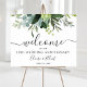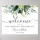 Denna välkomstskylt för bröllopsjubileum har målade akvareller av eukalyptus och gröna blad. För mer avancerad anpassning av denna design, klicka på den BLÅA DESIGNKNAPPEN. Matchande föremål finns också tillgängliga.