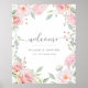Ett bröllop-tecken med ett omkrets av rosa och grönt vattenfärg ro och löv, och "välkommen" i grått-handskrivet teckensnitt. Anpassa med namn och bröllop.