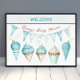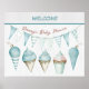 Ett välkomsttecken för en pojke-dusch. Flaggor och glasskoner i en känslig grönt och brunt