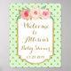 Anpassningsbarnas välkomsttecken poster för babydusch eller födelsedagsfest på mynta gröntar och guld punkter mönster med guld gräns, rustisk rosa och persikofärgade blommor och handskrivna stil-bokstäver.