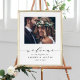 Modern välkomstskylt (poster) i bröllop med snyggtens kalligrafi och foto. Om du vill ha en mer avancerad anpassning av den här designen klickar du på länken Anpassa ytterligare om du vill ändra teckensnitt, storlekt och färg.