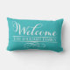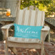 Utomhuskuddedesign för snyggt innehåller "Välkommen" i modernt, vitt skript med anpassningsbar namn-text och dekorativ dekorativ dekorativ dekorativ dekorativ dekorativ rulla. Den turkosa blå färg som kan anpassas för att koordinera med dekorationen.