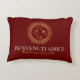 Snyggtens accentkuddar har röd bakgrund, grafiken guld måne och sol och lätt grått & guld typsnitt för att välkomna vänner och gäster på både engelska och italienska.