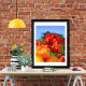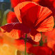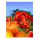 Vackra ljuseffekter på detta färgrika vallmofält . I bakgrunden skuggan av ett hus.