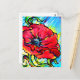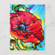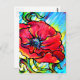 röd vallmo med grönt löv i gult och teal bakgrund, akryl på canvas av konstnären Nada Meeks