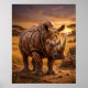 Monumental valnötssnideri föreställande en noshörning med en kraftfull noshörning formad av spruckna valnötsskal, varma nötstrukturer, polerade bruna ytor och detaljerade horn. Placerad i en strålande skördeslätt med akacieträd, gyllene gräs, klippformationer, rustika kärror och solnedgångshimmel, inger denna fantasifulla varelse en känsla av kraft och majestät. Perfekt för väggdekorationer, kontor, rustika hem, matrum, manlig dekoration eller samlare av djärv ätbar djurkonst.