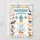 En söt valp hund fest inbjudan med massor av hundar. Inklusive, tysk herde, Huski, Jack Russel, Shiba Inu, Boston Terrier, Beagle, Bulldog och Pug.