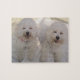 Två skämtsamma Bichon Frise valper som har roligt tillsammans! Ett förtjusande foto, som ska, gör dig att le, som du bygger ditt pussel!